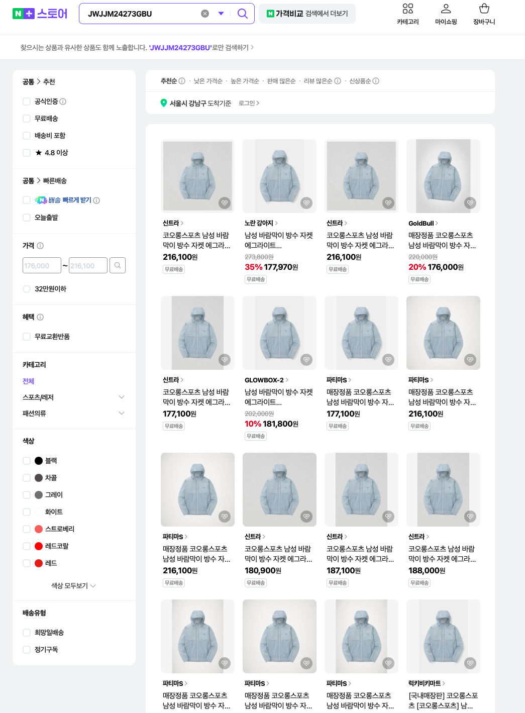 위의 캡쳐화면은 일명 “에그라이트”라고 불리는 코오롱스포츠의 바람막이 상품을 네이버 쇼핑몰로 검색했을 때 나오는 검색결과입니다. 캡쳐화면에는 다 나와있지 않지만, 저기 말고도 훨씬 많은 상점에서 해당 제품을 판매한다고 나와있지요. 이렇게만 보면 해당 제품의 재고가 상당히 많고, 여러 매장에서 절찬리에 팔고 있다는 인상을 받기 쉽습니다.