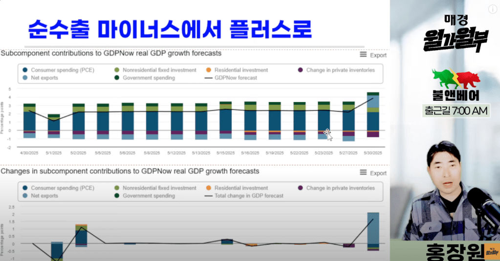 GDP now에서 GDP의 구성요소들 별로 통계를 내고 있는데, 2025년5월27일까지도 마이너스를 기록하던 순수출이 3일만에 갑자기 플러스로 전환된겁니다. 그것도 상승폭이 2%나는 기록적인 폭으로 순수출이 상승하게 된 것이죠. 그 이유는 관세전쟁의 여파로 미국 내로의 수입이 급감하면서 순수출이 늘어나게 된 것이죠.
