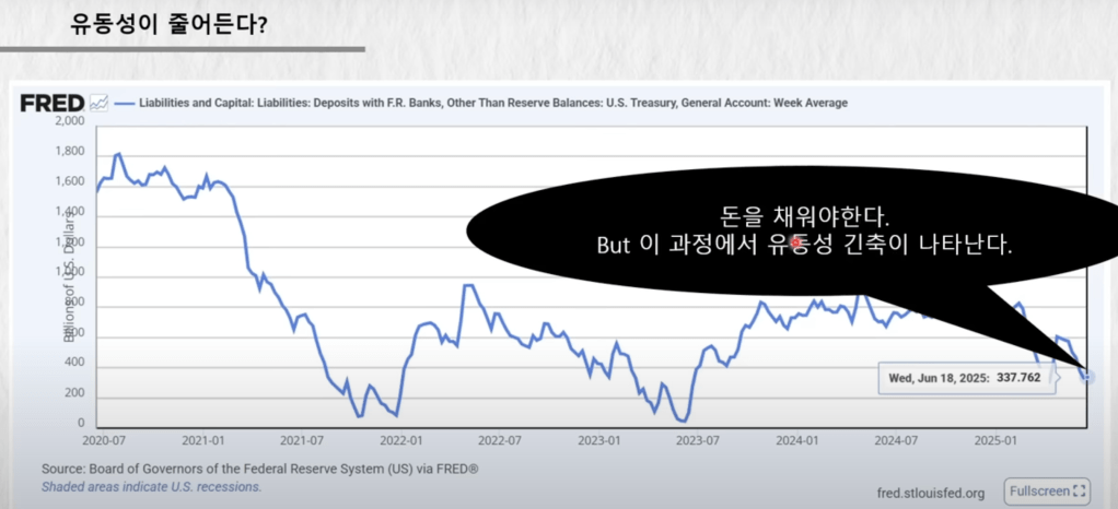 부채한도 협상이 체결 되기 전까지는 국채 발행이 막히기 때문에 TGA 잔고를 채우지 못하고 있다가 협상 체결이 예상되는 7월 중순 경 한꺼번에 많은 국채발행이 일어난다면, 이로 인해 7-8월 중으로 시중의 달러 유동성이 빨려들어가서 일시적인 유동성 고갈이 일어나며 주식시장에 조정이 일어날 수 있다는거지요.