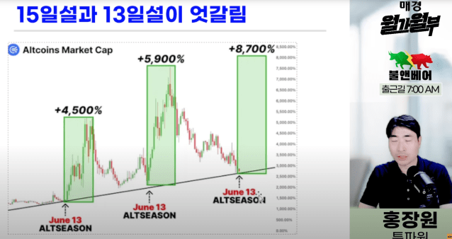위의 그래프는 과거 6월13일부터 폭등할거라는 주장을 하던 사람들이 근거로 제시하던 그래프입니다. 그런데, 알트코인 강세장이 시작되는 날짜가 저 표시대로 항상 6월 13일이었는지 실제 altcoin market cap 차트로 보면 아니거든요.