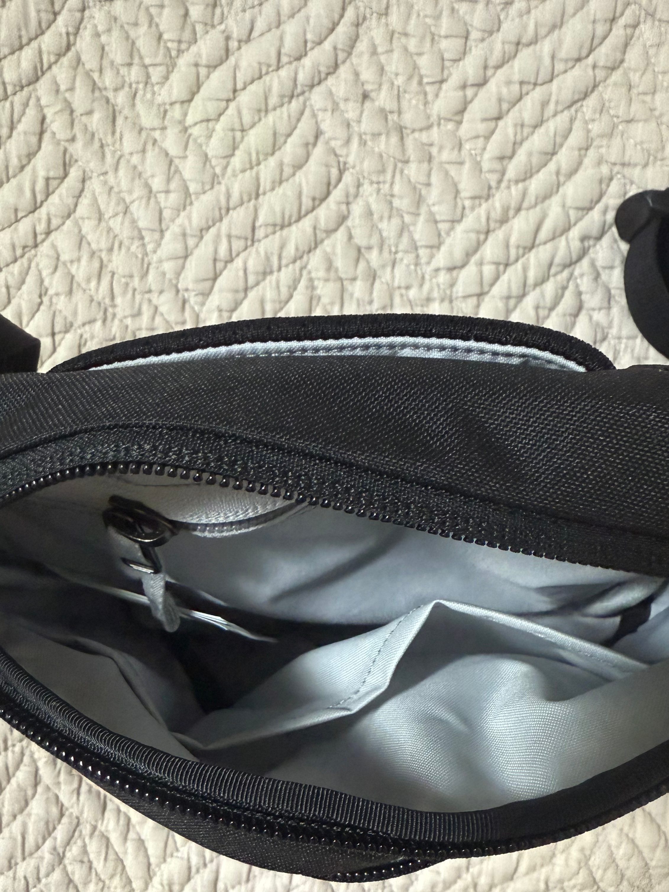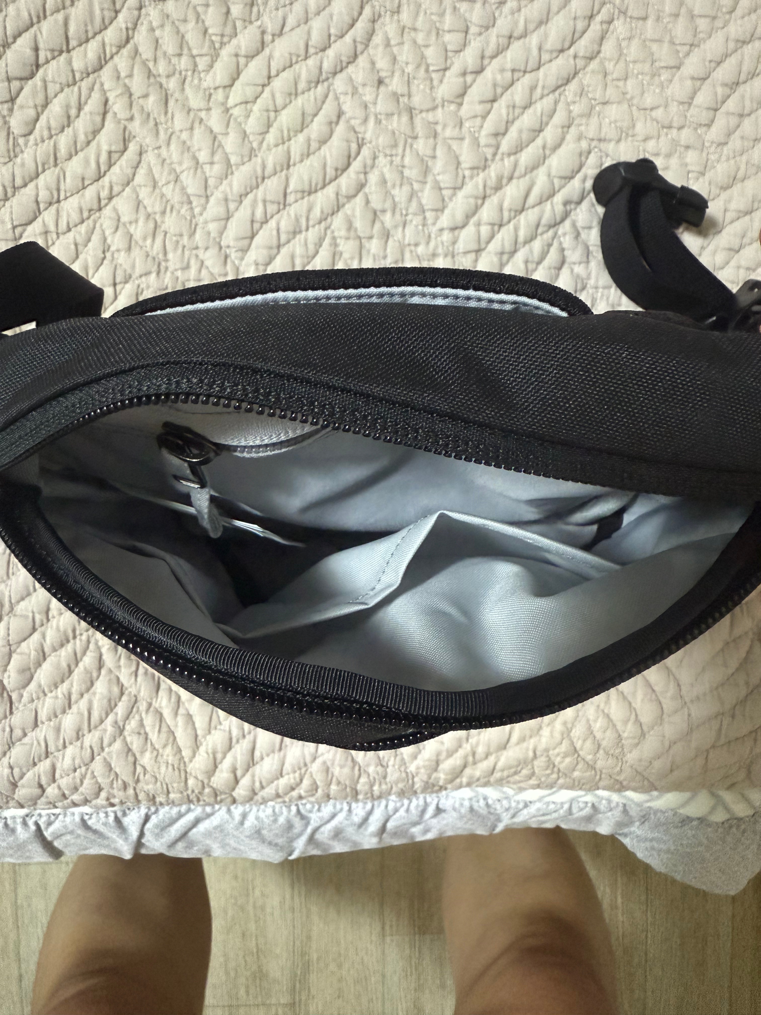 내부에는 지퍼와 칸막이가 있어서 구획이 세 곳으로 나뉩니다. 가방 자체가 늘어나는 재질이 아니라 수납할 수 있는 용량이 많지는 않습니다. 사진에는 나오지 않지만, 가방끈 길이를 조절하는 부분도 깔끔하고 사용하기 쉽게 잘 설계되있어서 좋았습니다.