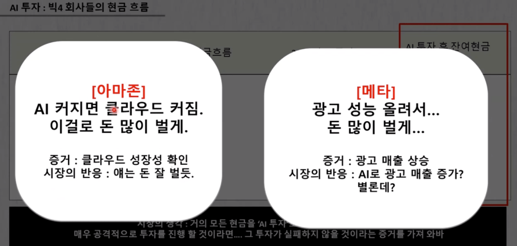 최근 실적 및 가이던스 발표 후 메타 주가가 하락한 반면 아마존은 상승했는데, 그 이유를 설명하고 있는 영상입니다. 영상의 내용은 아래의 캡쳐 이미지 한 장으로 요약될 수 있을것 같습니다.