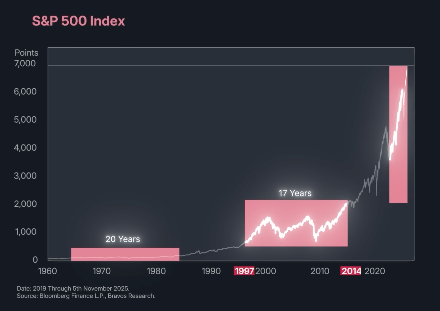 그 중 하나가 영상 초반에 나오는 이 그래프입니다. 미국의 S&P500 지수가 2배가 되는 데 걸리는 시간이 점점 짧아지고 있는 걸 보여주고 있는 그래프죠. 1960년에서 1980년 중반까지 지수가 2배 되는 데 20년이 걸렸다면, 1997년엔 17년, 그리고 2020년에서 현재까지 지수가 2배 되는 데 5년밖에 걸리지 않았습니다.