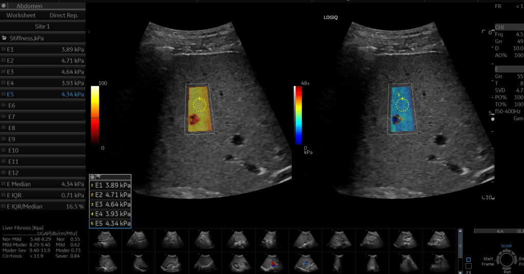 결론적으로, 탄성초음파는 탄성계수가 높을 경우에는 유의미한 간섬유화나 간내 염증의 증거가 될 수 있으나, 탄성계수가 정상범주 안 이라도 B모드 영상에서 의미있는 소견들이 존재한다면 반드시 만성 간질환의 가능성을 배제하지 말아야 합니다.