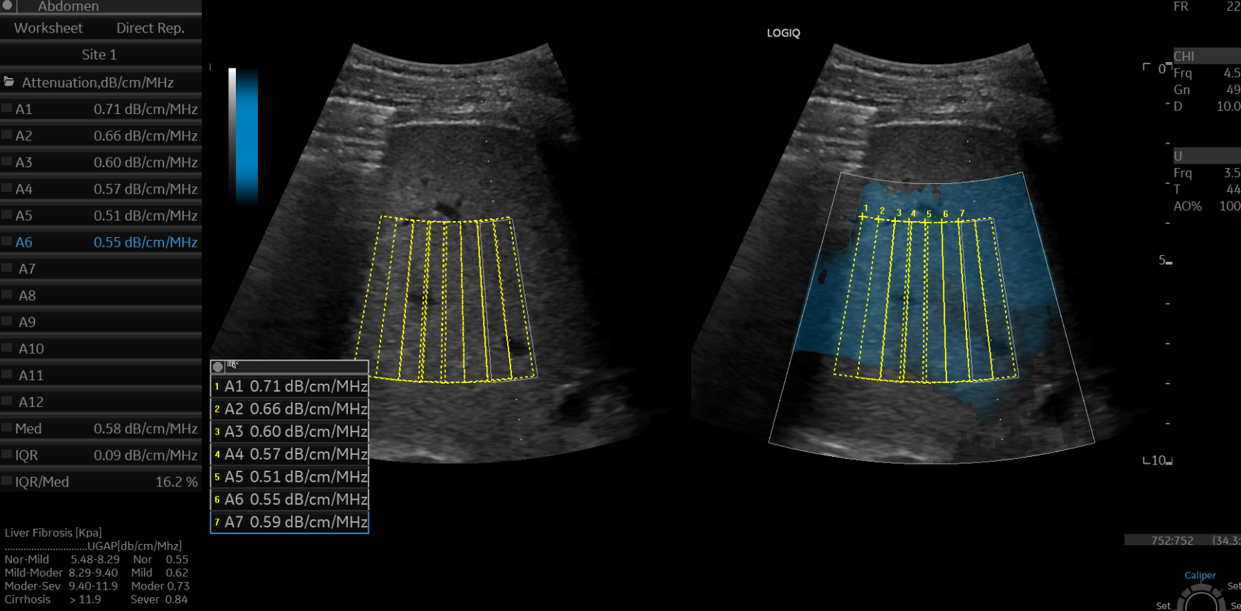 간초음파 B-mode 영상에서 거친 에코음영과 간 하연 둔화(inferior hepatic angle blunting)를 보여 전형적인 만성 간질환을 시사하고 있지만, 탄성초음파 상 탄성계수는 평균 4.3 kPa로 정상범주였으며, UGAP 정량분석에선 평균 0.58 dB/cm/MHz로 마찬가지로 정상범주 내였습니다.