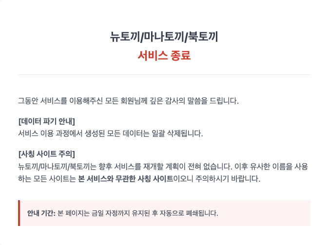 마약이라는 게 나쁜건지 잘 알고 있으면서도 한 개인이 그걸 맛본 다음에 끊는 건 쉽지 않습니다. 이런 특징을 가지고 있는 대표적인 게 불법 복제 컨텐츠 사이트라고 할 수 있죠. 저작권을 무시하고 불법으로 웹툰(뉴토끼), 웹소설(북토끼), 일본만화(마나토끼)를 업로드해서 사람들이 볼 수 있게 해놓고, 광고수익을 올렸던 아마도 국내 최대 사이트 세 곳이 오늘 서비스를 종료한다고 공지했습니다.